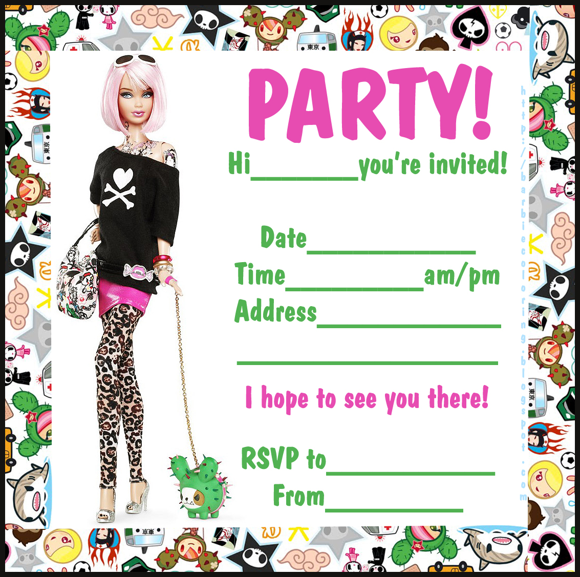 Here is a Tokidoki style Barbie invitation that is very very cute in its unique Japanese style. If you have a birthday party coming up soon - then you might like to use this free, printable party invitation with which to invite your guests- just print off how many copies you need and fill in the blanks such as the date, time and address etc. THIS IS PARTICULARLY SUITED TO A TEEN BIRTHDAY.